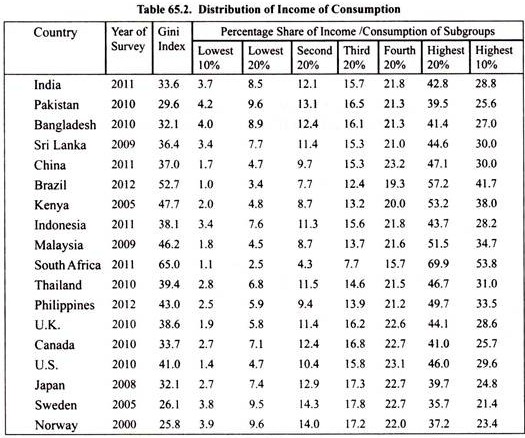Now, a glance at Table 65.2 will reveal that as judged by Gini index, inequality in distribution income/consumption expenditure there exist large differences in various countries of the world. In India in the year 2011 the bottom 20 per cent of the population received 8.5 per cent of income/consumption whereas the top or highest 20 per cent had 42.8 per cent share of the national income or consumption.