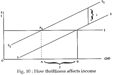 An increase in thriftiness usually raises savings and reduce consumption. It thus causes an upward shift of the saving schedule and a downward shift of the consumption schedule (function)). Consider Fig. 10. Here, the savings schedule shifts from SS to S1S2 and intersects the old investment schedule II at A1 (instead of B1). Consequently national income (measured on the horizontal axis) falls from OB to OA. Why? Because income has to fall — and fall in a multiplier way — until people feel poor enough to again want to save.