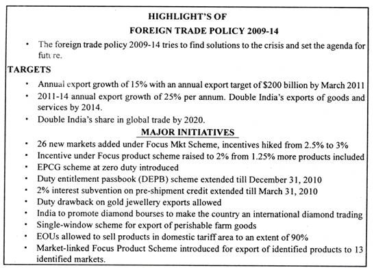 Against the fall in exports for the last 10 months, (October 2008 to July 2009) the Government announced its foreign trade policy for 2009-14 on August 27, 2009. Due to the global slowdown, some countries have resorted to protectionist measures posing barrier to free trade which has aggravated the problem for Indian exporters.