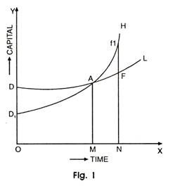 In diagram I, H and L curves show the flow of real output during a given time horizon with two techniques. The period ON is the period of recovery which makes the area DAD1 = area FAf1.
