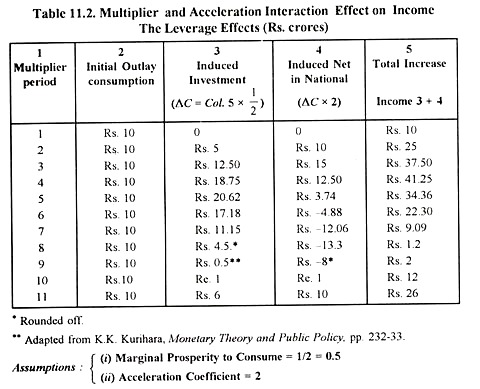 Since the MPC =1/2, induced consumption in the second period is Rs. 5 crores (shown in the column 3) and the acceleration coefficient being 2, the induced investment in the second period is Rs. 10 crores, (shown in column 4) and the total leverage effect (total increase in national income) is Rs. 25 crores (shown in column 5).
