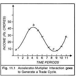 The principle of acceleration working by itself is perhaps not much forceful but recently it has attained more importance in the trade cycle theory by its alliance with the multiplier principle. Professor Samuelson has built a model of multiplier- accelerator interaction. He could show that the interaction of the accelerator with the multiplier is capable, under certain circumstances, of generating continuous cyclical fluctuations.