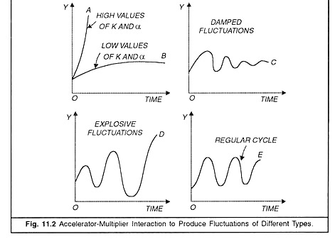 The essence of the argument is that multiplier-accelerator interaction is capable of generating various types of cycles and fluctuations: mild, damped and explosive. These cycles of fluctuations are of varying periodicity and amplitude. If we are able to find out the interacting values of the multiplier and accelerator in practice, we can ascertain for ourselves the nature of income fluctuations we are likely to experience in the absence of exogenous restraints. Professor JR. Hicks has used this mechanism for building up a theory of the trade cycle that explains the behaviour of business cycle around a rising trend of income.