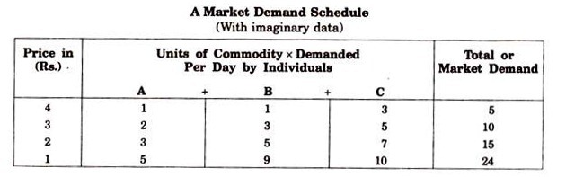 Apparently, it is constructed by the horizontal additions of quantities at various prices shown by the individual demand schedules. It follows that like an individual demand schedule, the market demand schedule also depicts an inverse relationship between price and quantity demanded.