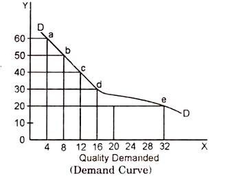 Along the horizontal axis (X-axis) the units of commodity Y demanded are measured, where as the price of a commodity is represented along with vertical axis (Y-axis) corresponding to the price quantity relations given in the demand schedule, various points like— a, b, c, d and e are obtained on the graph. These points are joined and a smooth curve DD is drawn, which is called the demand curve.