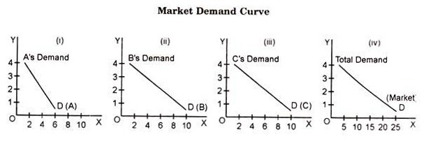 Market demand curve drawn above as in the panel (iv) is derived by the horizontal summation of individual demand curve in panel (i), (ii) and (iii).