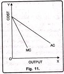 From Figure 11 it becomes clear that when due to the operation of the law of increasing returns, average cost falls, marginal cost also falls. The fall in marginal cost is much more than the average cost, so the marginal cost remains below the average cost.