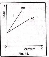 If a firm operates under the law of diminishing returns, it means its output increases at diminishing rate as it employs more and more units of factors of production. In this case, if AC increases MC also increases. The increase in MC will be much more than the increase in AC. It can be shown with the help of figure 12. The Figure 12 depicts that as AC increases MC also increases at a faster rate than the AC. Therefore, the curve MC remains above the curve AC.