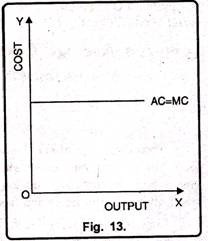 According to the law of constant returns when a firm employs more and more factors, output increases at a constant rate. Therefore, the average cost curve as well as marginal cost curve remains parallel to horizontal axis. This can be made clear with the help of diagram 13. In the diagram 13 output has been measured on OX- axis while costs on OY-axis. Here, we see that AC = MC and both are parallel to X-axis.