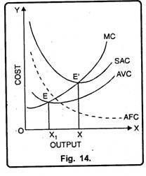 In Figure, the relationship between different cost curves can be explained with the help of figure 14. In Fig. 14 AFC is the average fixed cost curve which slopes downward. It indicates that as production increases, AFC goes on falling. In the beginning, it slopes steeply but later on rate of fall slows down. AVC is the average variable cost. It falls up to point E and then rises upward. SAC is the short run average cost curve having U-shape. The minimum point E of AVC occurs earlier than the minimum point E’ of SAC. MC passes from the minimum points of both AVC and SAC through the points E and E’ respectively.