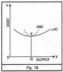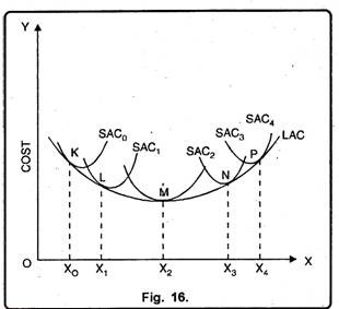 In Figure 16 long-run average cost has been shown. The long- run average cost curve is tangent to different short run average cost curves. In order to produce OX0 level of output, the corresponding point on LAC is K at which it 1S tangent to SAC0. Therefore, if a firm is willing to produce OX0 level of output, it will construct a plant corresponding to SAC0 and will operate on this curve at point K.