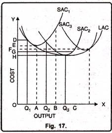 In the Fig. 17, short-run average cost curves of all the three types of plants have been shown. If the firm has to produce OQ1 output, it will select small plant. If it wants to produce OQ3 level of output, it will select the large output plant.