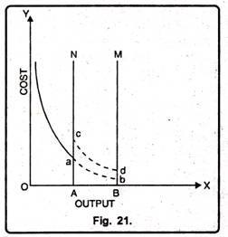 The firm also has some small sized machinery which set a limit to expansion. This is shown by the boundary line N.N, however, is not an absolute limit because the firm can expand its short run output up to M by paying overtime to labour for working longer hours. In this case, the AFC is shown by the dotted line ab. The firm can also expand output by purchasing some additional small-sized machinery. In this case, the AFC shifts upwards and starts falling again, as shown by the dotted line CD.