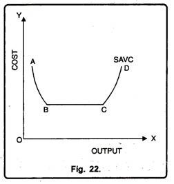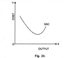 According to modern economists, short run average cost curve is continuously falling up to a given level of output. This given level of output represents reserved capacity output. Thereafter, average cost curve rising upward meaning thereby that average cost will rise rapidly if output is increased beyond reserved capacity. This is shown with the help of figure 23.