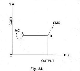 In the initial stages, SMC, to modem economist’s falls, from point A to B it becomes horizontal. Moreover, from A to B marginal cost is equal to average variable-cost. In this situation, production takes place under reserved capacity as shown in Figure 24.