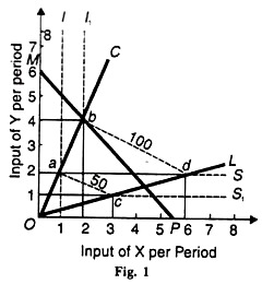 These output scales are established along the labour-intensive process ray OL, as represented by input combination’s с and d. If the points a and с at the 50 unit output level on the linear rays ОС and OL are joined, they form an isoquant (shown dotted) IacS1 .At the 100-unit output level, the corresponding isoquant is l1bdS.
