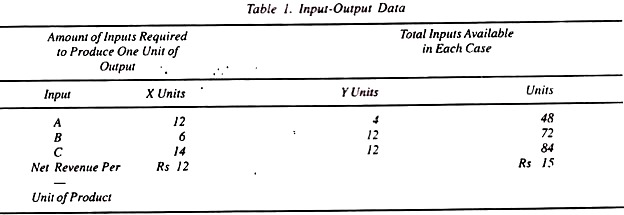 Take a firm that produces two products X and Y at given prices of Rs.12 and Rs.15 respectively for each unit. To produce product X, the firm requires 12 units of input A, 6 units of input В and 14 units of input C. Product Y requires 4 units of input A, 12 units of В and 12 units of input C.