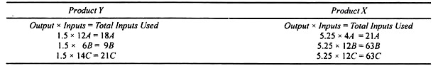 To produce one unit of X, the firm uses the inputs 12A + 6В + 14С. And to produce one unit of У, it uses the inputs 4A + 125 + 12C. Since the firm produces 1.5 units of X and 5.25 units of Y, the various inputs used to produce these units are presented in tabular form below.