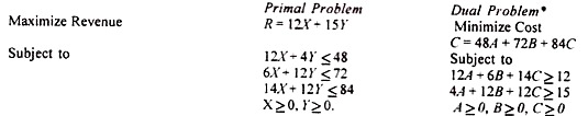 Every primal problem has its dual. In the above example, the primal relates to maximization of revenue. Its dual is minimization of cost.