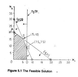 Now OABCD in Fig. 5.1 is the convex region and the points in O,A,B,C,D are called the feasible solutions to the L.P. problem. There is a fundamental theorem of L.P. which states the objective function is optimized at one of the corner points, i.e., O,A,B,C,D. Thus for maximum profit only these corner points, also called basic feasible solutions, are to be evaluated.