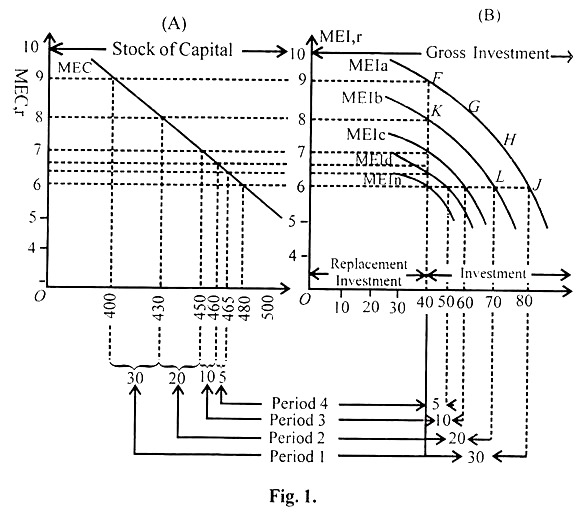 In the first period, only when net investment reached the 30 billion dollars the rate was the rise in prices of capital goods sufficient to produce the greater drop in MEI from 9 to 6 percent, or to equality with r. In other words, the greater spread between MEI and the r at the beginning of the first period permitted the higher rate of investment spending in that period.
