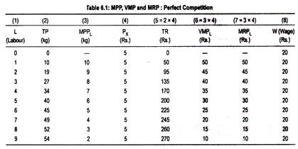 According to Table 6.1, for all units of labour employed, VMPL = MRPL. If perfect competition exists in the product market, VMPL coincides with the MRPL (since AR = MR).