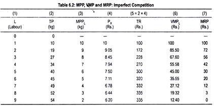 In other words, as a monopoly seller or a monopolistically competitive seller behaves as a price-maker, price of the commodity does not remain constant. Under the circumstance, as AR > MR, VMPL must exceed MRPL. This is shown in Table 6.2.
