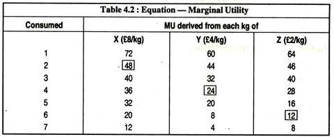 Any number of commodities may then be added to the equation. Table 4.2 gives marginal utility figures for a consumer who wants to distribute expenditure of £44.00 between three commodities, X, Y and Z: