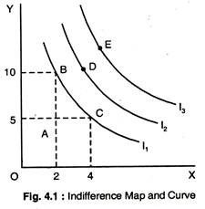 In order to explain indifference curves, we will make simplifying assumption that the consumer only buys two goods or two baskets of goods — X and Y. The consumer’s preference for X and Y are represented by the indifference map in Fig. 4.1, where l1, I2, and I3 are three indifference curves.