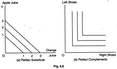 In Fig. 4.6(a) consumer views orange juice and apple juice are perfect substitutes; consumer is indifferent between a glass of one and the other. The ICS with perfect substitute have a constant slope. In Fig. 4. 4.6(b) consumer views left shoes and right shoes as perfect complements. An additional left shoe gives consumer no extra satisfaction unless consumer also obtains the matching right shoe.