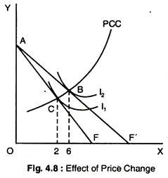 It becomes less steep reflecting the fall in the relative price of X. The effect of the price fall on the consumer equilibrium point is shown in Fig. 4.8, it moves from point C to point B. The line CB is called the price- consumption curve. The fall in the price of X causes the consumer’s demand for it to increase from 2 to 6.