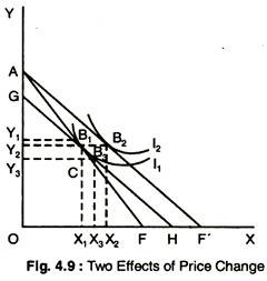 The new budget line is GH and the movement of consumer’s equilibrium point from B1 to B3 is the substituted effect — the consumer is no better-off, but has substituted X1 X3 of X for Y1Y3 of Y because of the change in relative prices. The movement from B3 to B2 is due to income effect — the consumer buys X3X2 of X and Y3Y2 of Y because of his increase in real income.