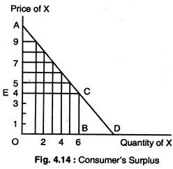 Similarly, he would have been prepared to pay £8 for the second unit, £7 for the third unit and so on. Since a single price of £4 prevails iii the market, he has only had to pay £24 for the six units (area OBCE), instead of £39 (area OACB). The difference (£39 – £24 =) £15 can be thought of as the consumer’s surplus and is represented by the area under the demand curve and above the price line ECA.