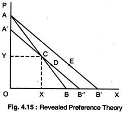 If the price of X falls, the budget line will shift to AB’. The income effect of this price change can be eliminated by shifting the budget line to A ‘B” parallel to AB. Having revealed that the consumer preferred point C to any other points in the triangle AOB, he will not now choose any points along the section A’C. He must, therefore, choose a point along the line CB”, say point D.