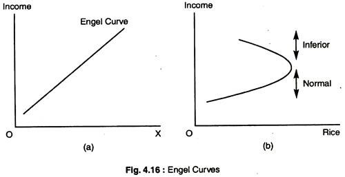 In both figures, as income increase, the consumption of X also increases. The upward-sloping Engel curve applies to all normal goods. Figure 4.16(b) shows the Engel curve for rice. We see that rice consumption increases initially as income increases. As income increases further, consumption falls. The portion of the Engel curve that is downward-sloping is the income range in which rice is an inferior good.