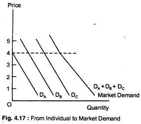 However, the market demand curve need not be a straight line, even though each of the individual demand curves is. In Fig. 4.17, for example, the market demand curve is kinked as one consumer makes no consumption at prices.