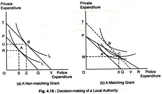 As a result, a matching grant lowers the relative cost of the publicly provided goods. In Fig. 4.18(b), the matching grant relates the budget line outward from PQ to PR. If no local money is spent on police, the budget line remains unchanged. However, if they decide to spend money on the public sector, the budget increases.
