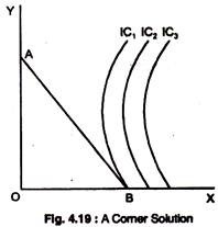 The indifference curve analysis can be used to show conditions under which consumers choose not to consume a particular good. In Fig. 4.19, faced with budget line AB, a consumer chooses to purchase only X and no Y.