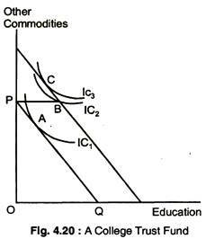 The budget line that Peter faces before the trust fund being awarded is given by PQ. The trust fund expands the budget line outward so long as the full amount, PB, is spent on education. By accepting the trust fund and going to college, Peter increases his satisfaction, moving from A on IC1, to B on IC2.