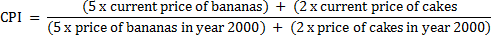 In this CPI, 2000 is taken as the base year. This index indicates the cost of buying 5 bananas and 2 cakes today compared to how much it had cost to buy the same basket in 2000.