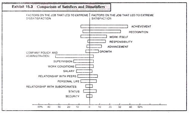 Frederick Herzberg’s theory is also called motivation-hygiene theory. Herzberg believed that individual’s relation to work is a basic one. Individual’s attitude towards work determines his/her success or failure on the job. Herzberg conducted a study by asking the question: What do people want from their jobs? He asked the respondents to describe situations or events when they felt exceptionally good and bad about their jobs. The responses of the respondents are tabulated as presented in Exhibit 15.3.