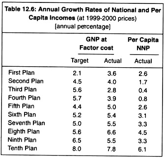 Growth of national income in the First Plan was well ahead of the target. Between Second and Fifth Plans, growth rate of national income fell below the targeted rate. The growth rate picked up marginally in later plans. Ninth and the Tenth Plan also exhibited an actual growth rate that remained below the target rate. However, not only actual growth rate was low but it also exhibited ups and downs.
