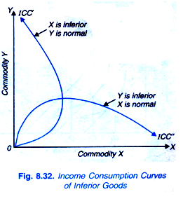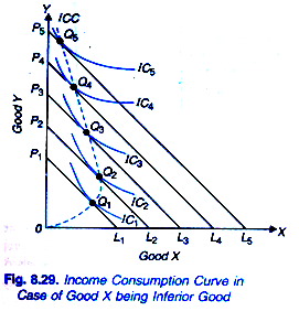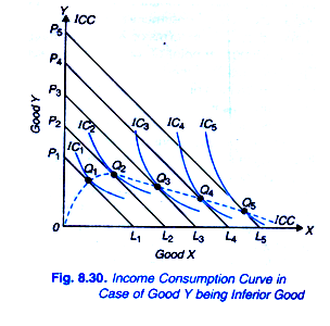 This signifies that good Y is an inferior good because beyond point Q2, income effect is negative for good Y and as a result its quantity demanded falls as income increases. It follows from above that the income consumption curve can have various possible shapes.