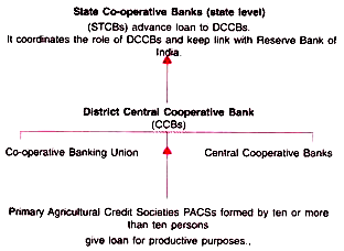 The rural co-operative credit institutions in India have been organised into short-term and long-term structures. The short-term co-operative structure is based on three-tier structures, except the states in the northeast region. At the lowest tier are the Primary Agricultural Credit Societies (PACSs). These are organised at the village level. At the second tier and District Central Cooperative Banks (DCCBs) organised at the district level. At the third and uppermost tier are the State Co-operative Banks (STCBs) organised at the state level state Co-operative Banks (state level).