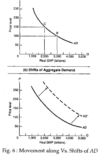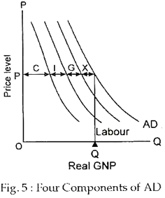 Fig. 5 shows a typical AD curve. The four components of AD are also shown separately. At the existing price level, P consumption is OC, investment (CI), government expenditures (IC) and net export (GQ). All four components add up to Q. In other words, the four spending streams, at the existing price level together constitute AD.