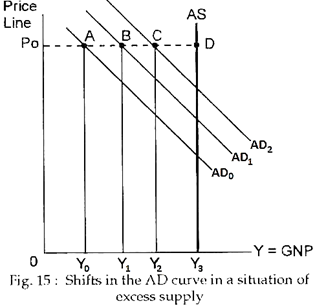 J.M. Keynes pointed out that when an economy has excess capacity, shifts in the aggregate demand curve result in different levels of output at the fixed price level, P0. This point is illustrated in Fig. 15. Here POABCD is the aggregate supply curve and Y3 is the potential (or full employment) output.