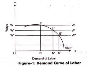 In Figure-1, when the wage rate is OW and the demand for labor is ON, then the equilibrium is attained at point E. Similarly, at point E’, the wage rate is OW and demand for labor is ON’ and at E” the wage rate is OW” with demand for labor ON”. MRP represents the demand curve for an individual organization. However, it is required to determine the market demand for labor.