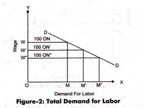 However, in Figure-2, when the wage rate for an industry is OW, then the demand for labor is OM = 100 ON, which is the demand for labor for 100 organizations in the industry). Similarly, when the wage rate of industry is OW then demand of labor is OM’ (=100 ON’) and at OW” it is OM” (=100 ON”). The downward slope of demand curve DD represents that increase in labor would result in the decrease of marginal productivity.