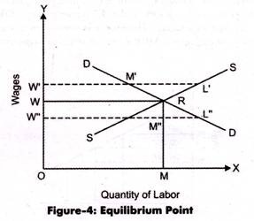 In Figure-4, demand and supply curves of labor intersect each other at point R, which is the equilibrium point. At point R, the wage rate is OW (=MR) and demand for labor is OM. At wage rate of OW, the demand for labor is W’M’, which is less than its supply. This implies that there is surplus of labor in the market.