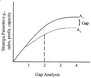 Thus, for instance, it will take a considerably longer period to create production facilities for computer hardware than for production (say) a newly designed software. A technique which has been found useful in determining the time horizon for environmental forecasting is that of ‘Gap Analysis’. Application of this technique will be clear from the following diagram which depicts a typical situation.